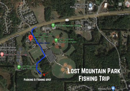 We will meet and fish at Lost Mountain Park. There is a fishing lake by the tennis courts, please see the image, showing the way into the park, as well as the short drive up onto the dirt road leading to the lake. There is a small amount of parking here at the red arrow.