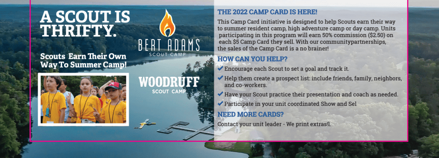 2022 Camp Cards are discount cards to businesses around Atlanta that your Scouts can use as a fundraiser for Scouting activities. For every $10.00 card sold, your Scout earns $4.75 for themselves or their Troop. These funds can be used for any Scouting activity, including Day Camp and Summer Camp. Those who BUY the card get discounts all over town. Some repeat, some do not.