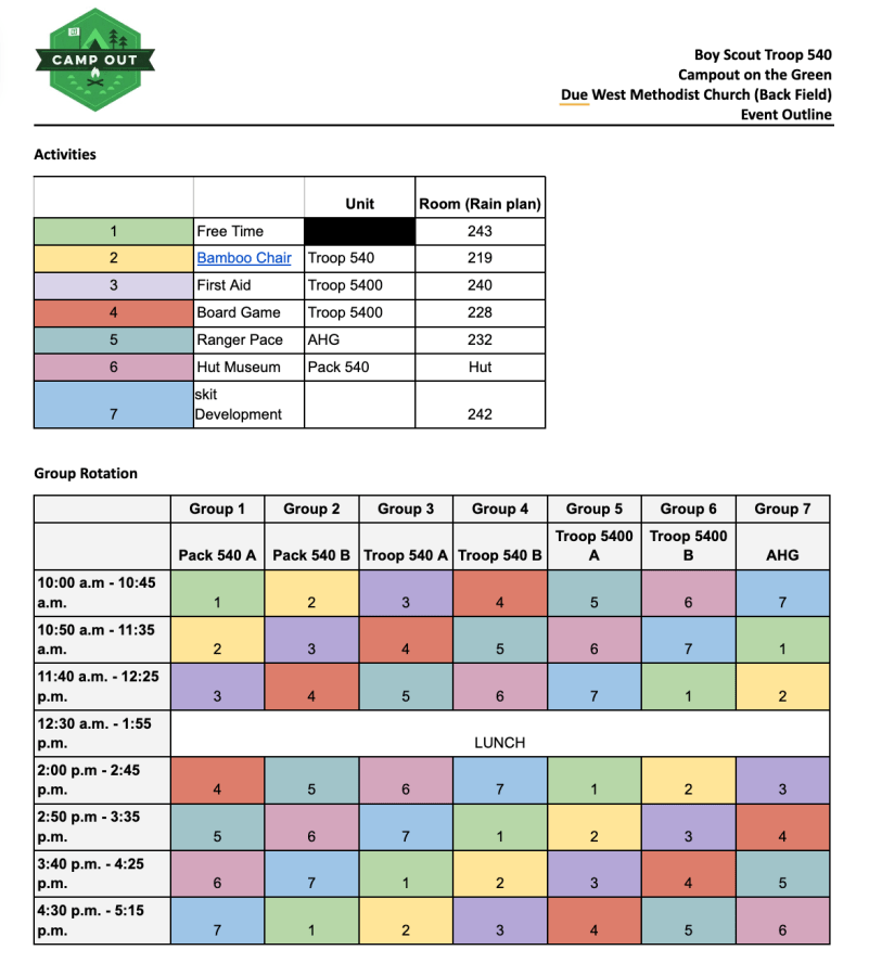 10am – activity rotations begin (please see the color-coded schedule below)